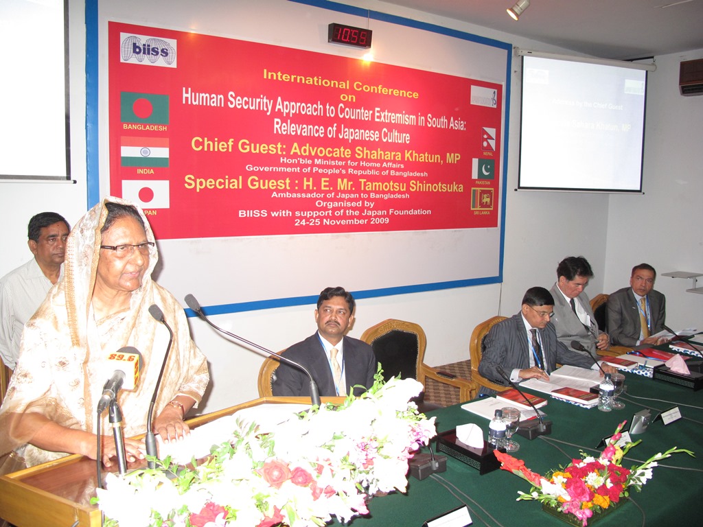 An International Conference on Human Security Approach to Counter Extremism in South Asia: Relevance of Japanese Culture was held at BIISS Auditorium on 24 November 2009. The Conference was organised by BIISS with the support of the Japan Foundation. Major General Sheikh Md Monirul Islam, ndc, psc, Director General, BIISS delivered the welcome address. Advocate Shahara Khatun, MP, Hon'ble Minister for Home Affairs Government of the Peoples Republic of Bangladesh was the Chief Guest at the Inaugural Session of the Conference. H. E. Mr. Tamotsu Shinotsuka, Ambassador of Japan to Bangladesh was present as Special Guest at the Inaugural Session . Major General Muhammed Firdaus Mian, psc, Chairman, Board of Governors, BIISS, chaired the session. Beside Bangladesh the scholars from India, Japan Nepal, Pakistan and Sri Lanka presented papers in the conference. In the First Working Session papers were presented by Dr. Moonis Ahmar, Professor and Chairman, Department of International Relations, University of Karachi, Pakistan on State of Human Security in South Asia and Prof. Sahadevan Ponmoni, Chairperson, Centre for South, Central, South East Asia & South West Pacific Studies, School of International Studies, Jawaharlal Nehru University, Delhi, India on Mapping Extremism in South Asia. The discussants were Dr. Iftekharuzzaman, Executive Director, Transparency International Bangladesh (TIB) and Brigadier General Shahedul Anam Khan, ndc, psc, (Retd.), Editor, Strategic Affairs, The Daily Star, Bangladesh respectively. Major General Sheikh Md. Monirul Islam, ndc, psc, Director General, BIISS chaired the session. In the Second Working Session presentations were made by Prof. Gamini Keerawella, Head, Department of History University of Pearadeniya, Kandy, Sri Lanka on Human Security and Extremism in Sri Lanka: Synergy and Conflict, Dr. Anindya Jyoti Majumdar, Department of International Relations, Jadavpur University, Kolkata, India on Human Security and Extremism in India: Synergy and Conflict and Dr. Abul Kalam Azad, Research Director, BIISS on Human Security and Extremism in Bangladesh: Synergy and Conflict. The discussants included Mr. A.K.M. Abdus Sabur, Research Director, BIISS, Dr. A T Salahuddin Ahmed, Senior Research Fellow, BIISS and Dr. M. Enamul Hoque, Former Inspector General of Police, and Member, Law Commission, Bangladesh. The session was chaired by Ambassador M. Maroof Zaman, Additional Foreign Secretary, Ministry of Foreign Affairs, Bangladesh. Major General Muhammad Firdaus Mian, psc, Chairman, BOG, BIISS chaired the Third Working Session. Papers were presented by Prof. Dr. Bishnu Hari Nepal, Former Ambassador of Nepal to Japan on Human Security and Extremism in Nepal: Synergy and Conflict , Dr. Shaheen Akhtar, Research Fellow, Regional Studies, Islamabad, Pakistan on Human Security and Extremism in Pakistan: Synergy and Conflict and Mr. Osamu Miyata, Associate Professor, University of Shizuoka, Japan on Human Security as a Policy Tool in Japan. The discussants were Dr. Abdur Rob Khan, Associate Professor, North South University, Dhaka, Air Cdre Ishfaq Ilahi Choudhury, ndc, psc, (Retd), Registrar, The University of Asia Pacific, Dhaka and Dr. Imtiaz Ahmed, Professor, Department of International Relations, University of Dhaka respectively. In the Fourth and Concluding Session Mr. Katsuhisa Furukawa, Fellow, Research Institute of Science and Technology for Society, Japan Science and Technology Agency, Tokyo, Japan and Dr. Shaheen Afroze, Research Director, BIISS presented papers on Japan and its Culture of Peace: Relevance for South Asia and A Comparative Study of the Solutions and their Practicability respectively. Ambassador Jamil Majid, Former Principal, Foreign Service Academy and Former Ambassador of Bangladesh to Japan and Prof. Syed Anwar Husain, Department of History, University of Dhaka were the designated discussants. Prof. Muzaffer Ahmad, Former Chairman, Transparency International Bangladesh (TIB) and Member, Board of Governors of BIISS was present as Chief Guest at the Concluding Session . Major General Sheikh Md. Monirul Islam, ndc, psc, Director General, BIISS chaired the Concluding Session . In the Open Discussion of the sessions of two-day conference there were lively participation by academia, media, government officials, business circles, representatives from the civil society and NGOs as well as other concerned professionals.