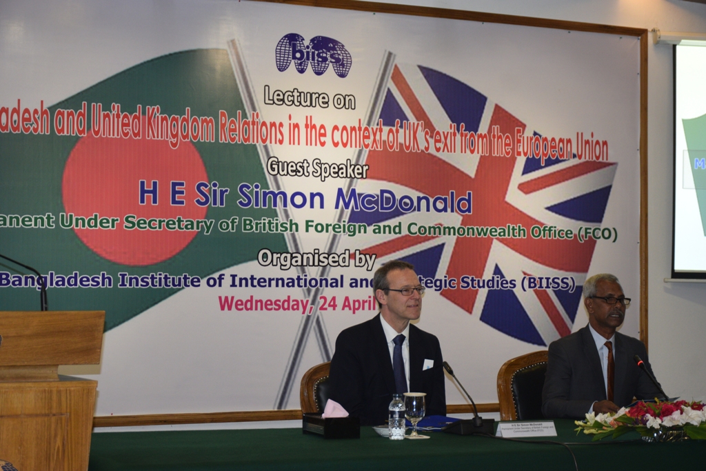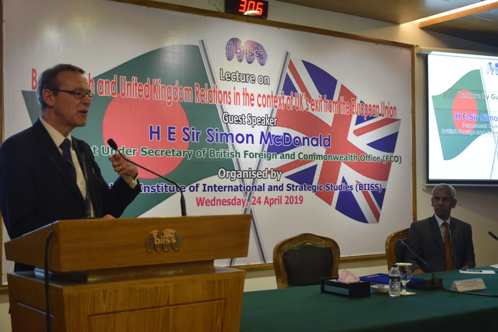 Bangladesh Institute of International and Strategic Studies (BIISS) organised a public lecture on “Bangladesh and United Kingdom Relations in the context of UK’s exit from the European Union” on 24 April 2019 at BIISS auditorium. H E Sir Simon McDonald, Parmanent Under Secretary of British Foreign and Commonwealth Office (FCO) was present as the Guest Speaker. Major General A K M Abdur Rahman, ndc, psc, Director General, BIISS, delivered the Welcome Address.