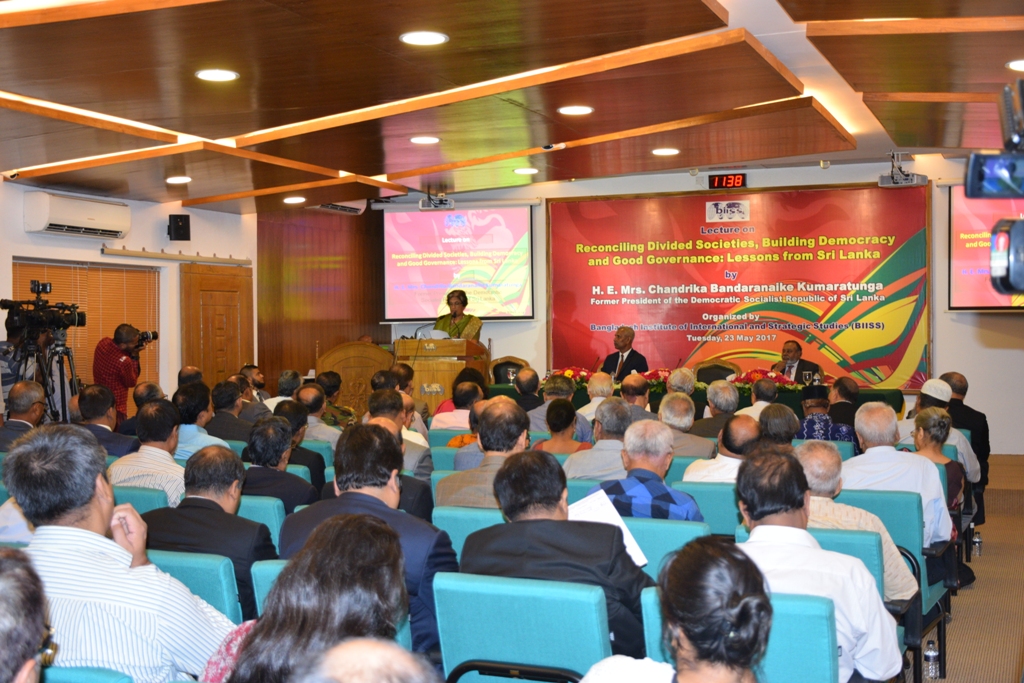 Bangladesh Institute of International and Strategic Studies (BIISS) organised a lecture titled “Reconciling Divided Societies, Building Democracy and Good Governance: Lessons from Sri Lanka” at its auditorium in Dhaka on 23 May 2017, where H. E. Mrs. Chandrika Bandaranaike Kumaratunga, former president of the Democratic Socialist Republic of Sri Lanka and member of Global Leadership Foundation was the Guest Speaker. Major General A K M Abdur Rahman, ndc, psc, Director General, BIISS delivered the address of welcome while Ambassador Munshi Faiz Ahmad, Chairman, Board of Governors, BIISS, chaired the session and delivered the closing remarks.