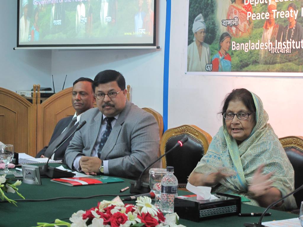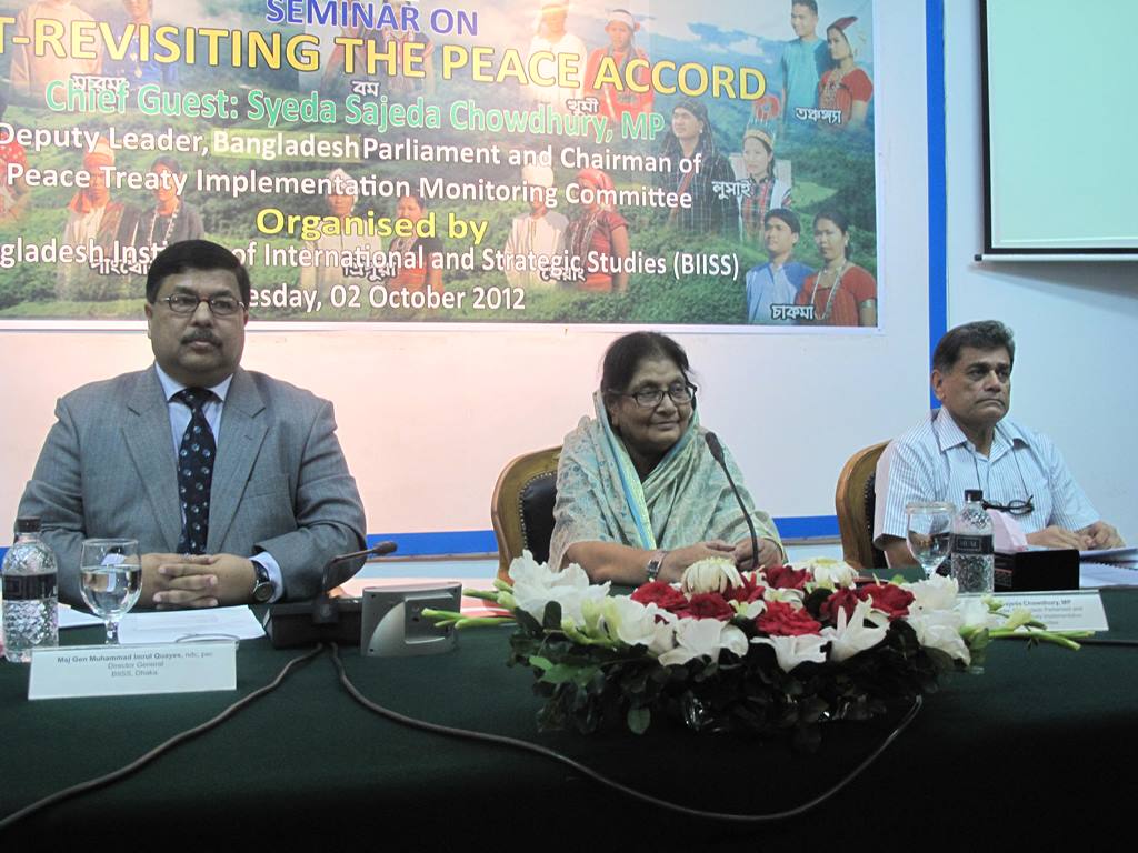 A Seminar on CHT Revisiting the Peace Accord was organised by Bangladesh Institute of International and Strategic Studies (BIISS) at the institute's Auditorium in Dhaka on 02 October 2012. The objectives of the Seminar were to (a) discuss about the progress of the implementation of the CHT Peace Accord and its positive effects on the overall development of the CHT, (b) to bring out the impediments and also find the ways out to overcome the impediments in implementing the Accord and (c) to discuss the role of Bangladesh Government, Bangalee, Tribal and other stakeholders for the implementation of the Peace Accord. Major General Muhammad Imrul Quayes, ndc, psc, Director General of BIISS, delivered the Welcome Address. Syeda Sajeda Choudhury, MP, Deputy Leader of the Bangladesh Parliament and Chairman of Peace Treaty Implementation Monitoring Committee, Government of the People's Republic of Bangladesh graced the occasion as the Chief Guest.