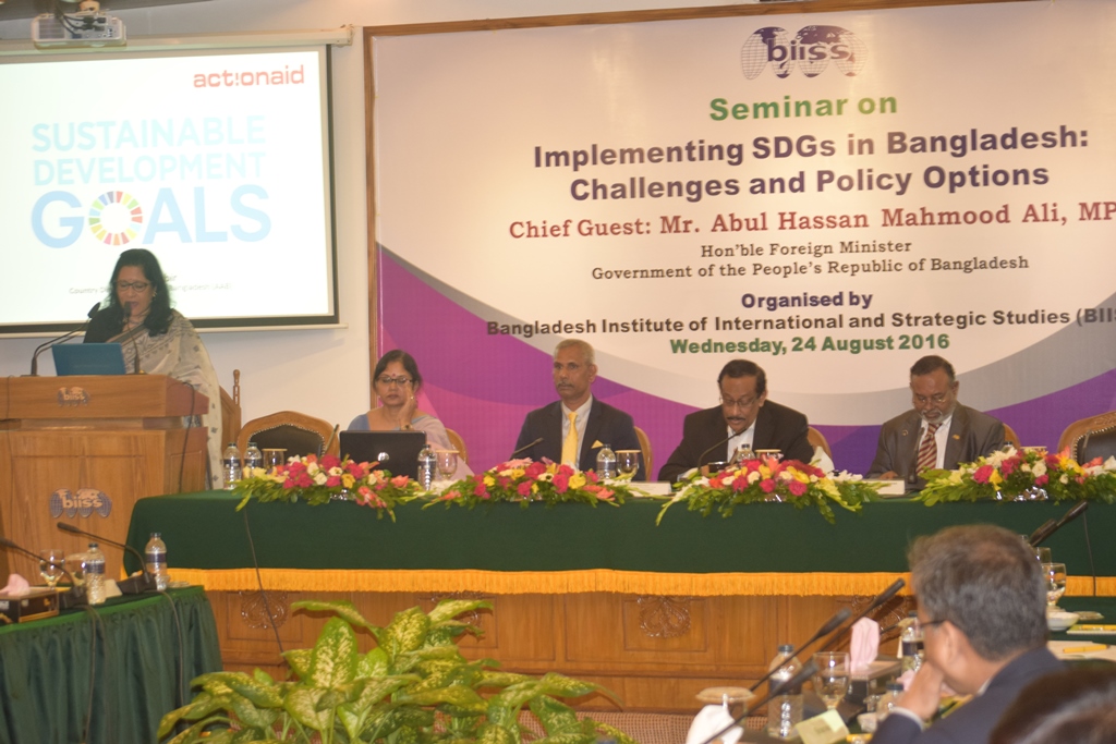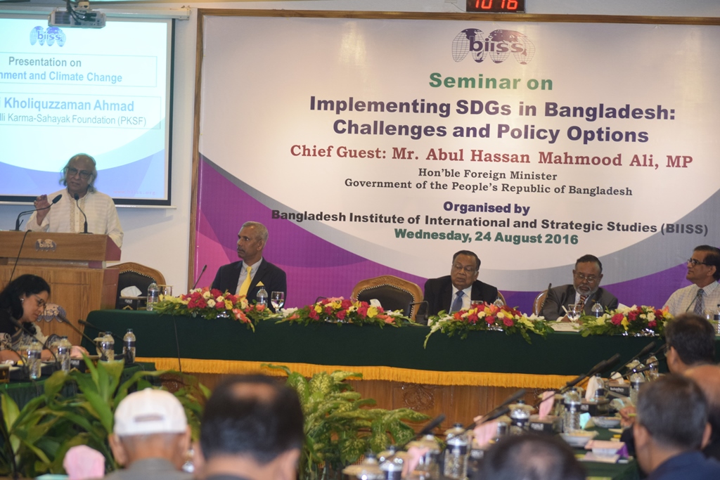 Bangladesh Institute of International and Strategic Studies (BIISS) organised a seminar on “Implementing SDGs in Bangladesh: Challenges and Policy Options” on 24 August 2016 at BIISS Auditorium. Mr Abul Hassan Mahmood Ali, MP, Honourable Foreign Minister, Government of the People’s Republic of Bangladesh was the Chief Guest at the Seminar. The seminar was divided into three sessions including two working sessions. Ambassador Munshi Faiz Ahmad, Chairman, Board of Governors, BIISS, chaired the inaugural and second working session. The first working session was moderated by Dr KAS Murshid, Director General, BIDS. Scholars, academicians, policy makers, former and current government officials were present in the seminar.