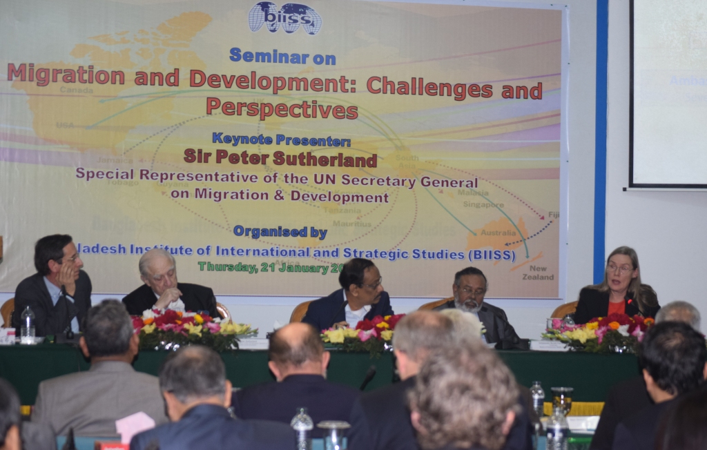 The seminar on “Migration and Development: Challenges and Perspectives” was organised jointly by Bangladesh Institute of International and Strategic Studies (BIISS) and Ministry of Foreign Affairs, Government of the People’s Republic of Bangladesh on Thursday, 21 January 2016 at BIISS Auditorium. Sir Peter Sutherland, Special Representative of the UN Secretary-General (SRSG) on Migration and Development made the keynote presentation. The designated discussants were Eva Akerman Borje, Seventh GFMD Chair, Sweden; and Mr John Bingham, ICMC, Global Civil Society Coordinator. Mr Md. Shahidul Haque, Foreign Secretary, Government of Bangladesh started the seminar with opening remarks and introduction of the speaker. Ambassador Munshi Faiz Ahmad, Chairman, Board of Governors of BIISS made the concluding remarks.