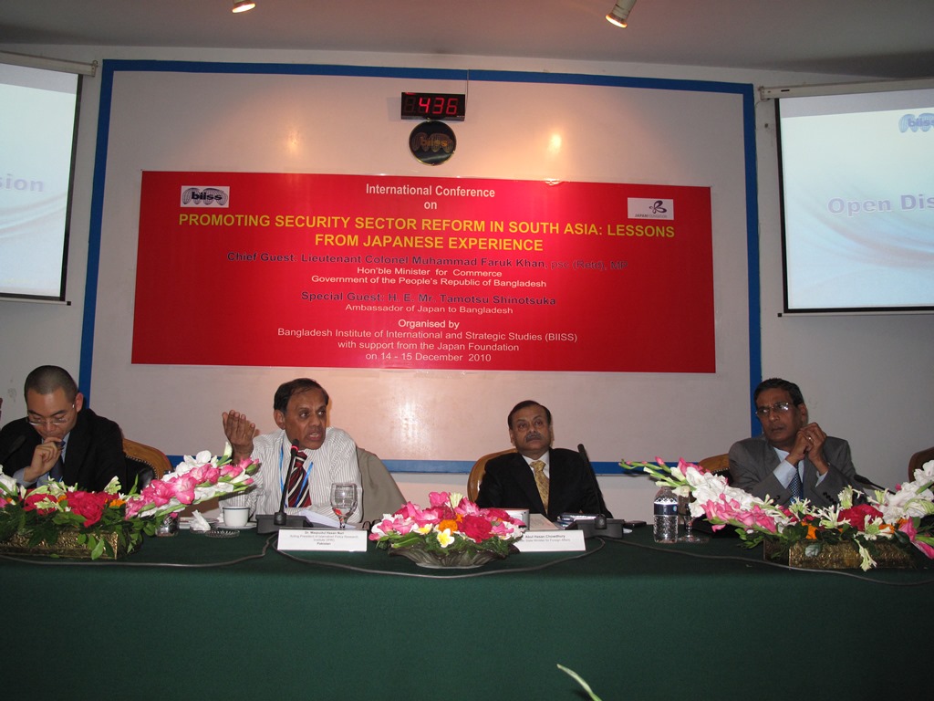 A two-day International Conference on Promoting Security Sector Reform in South Asia: Lessons from Japanese Experience was held at BIISS Auditorium from 14 December 2010 to 15 December 2010. The Conference was organised by BIISS with the support of the Japan Foundation. Colonel A K M Nazrul Islam, afwc, psc, G, Acting Director General, BIISS delivered the welcome address. Lieutenant Colonel Muhammad Faruk Khan, psc (Retd), MP, Hon'ble Minister for Commerce Government of the Peoples Republic of Bangladesh was the Chief Guest at the Inaugural Session of the Conference. H. E. Mr. Tamotsu Shinotsuka, Ambassador of Japan to Bangladesh was present as Special Guest at the Inaugural Session. Major General Muhammed Firdaus Mian, psc, Chairman, Board of Governors, BIISS, chaired the session.