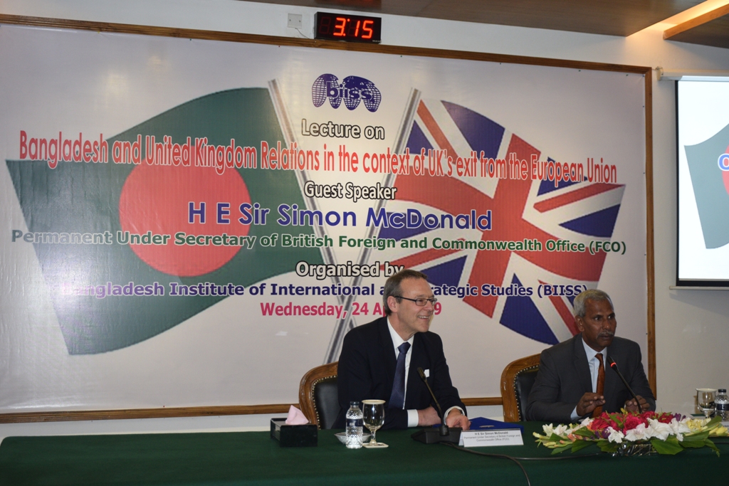 Bangladesh Institute of International and Strategic Studies (BIISS) organised a public lecture on “Bangladesh and United Kingdom Relations in the context of UK’s exit from the European Union” on 24 April 2019 at BIISS auditorium. H E Sir Simon McDonald, Parmanent Under Secretary of British Foreign and Commonwealth Office (FCO) was present as the Guest Speaker. Major General A K M Abdur Rahman, ndc, psc, Director General, BIISS, delivered the Welcome Address.