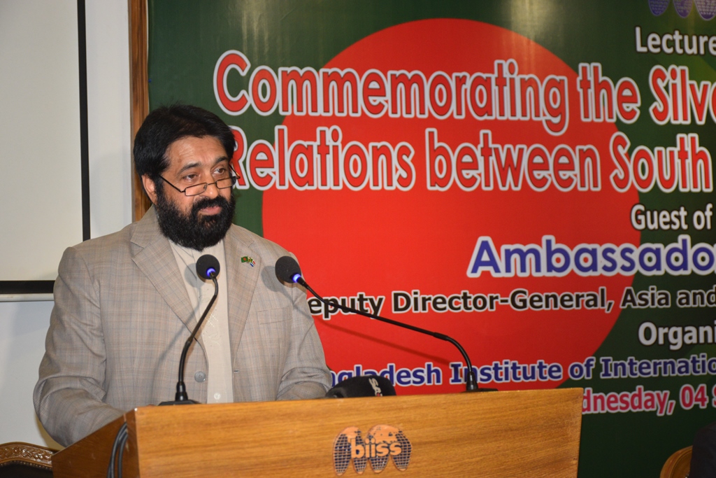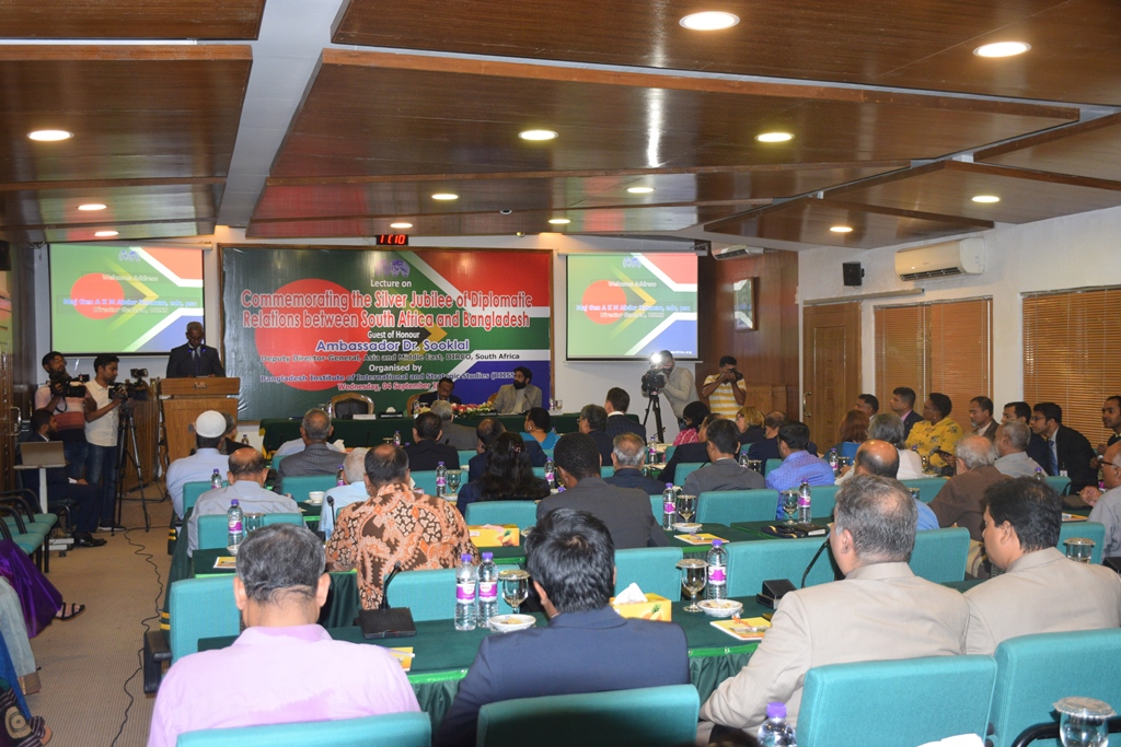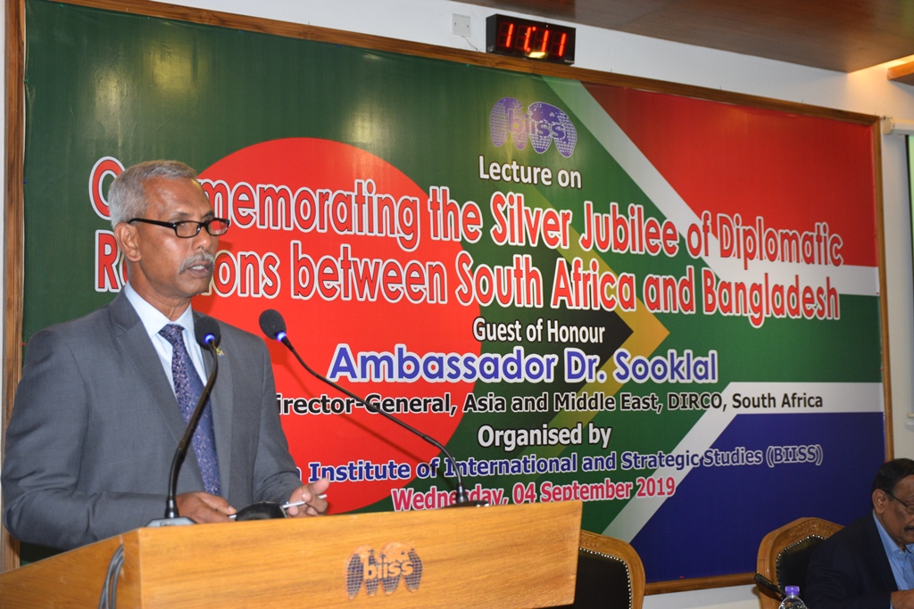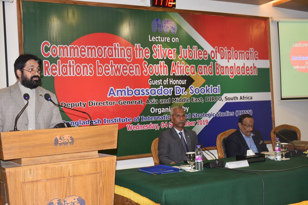 Bangladesh Institute of International and Strategic Studies (BIISS) organised a lecture in its Eminent Persons Lecture Series (EPLS) titled “Commemorating the Silver Jubilee of Diplomatic Relations between South Africa and Bangladesh”, on 04 September 2019. His Excellency Ambassador Dr. Anil Sooklal, Deputy Director General, Asia and Middle East, Department of International Relations and Cooperation (DIRCO), South Africa, graced the occasion as the guest speaker. Major General AKM Abdur Rahman, ndc, psc, Director General, BIISS commenced the session with his address of welcome. Mr. Md. Shahidul Haque, Foreign Secretary, Government of Bangladesh, chaired and concluded the session