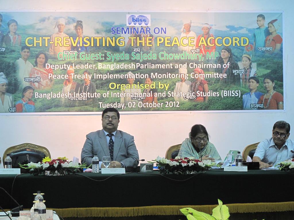 A Seminar on CHT Revisiting the Peace Accord was organised by Bangladesh Institute of International and Strategic Studies (BIISS) at the institute's Auditorium in Dhaka on 02 October 2012. The objectives of the Seminar were to (a) discuss about the progress of the implementation of the CHT Peace Accord and its positive effects on the overall development of the CHT, (b) to bring out the impediments and also find the ways out to overcome the impediments in implementing the Accord and (c) to discuss the role of Bangladesh Government, Bangalee, Tribal and other stakeholders for the implementation of the Peace Accord. Major General Muhammad Imrul Quayes, ndc, psc, Director General of BIISS, delivered the Welcome Address. Syeda Sajeda Choudhury, MP, Deputy Leader of the Bangladesh Parliament and Chairman of Peace Treaty Implementation Monitoring Committee, Government of the People's Republic of Bangladesh graced the occasion as the Chief Guest.