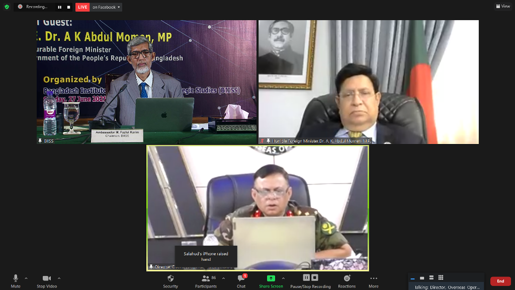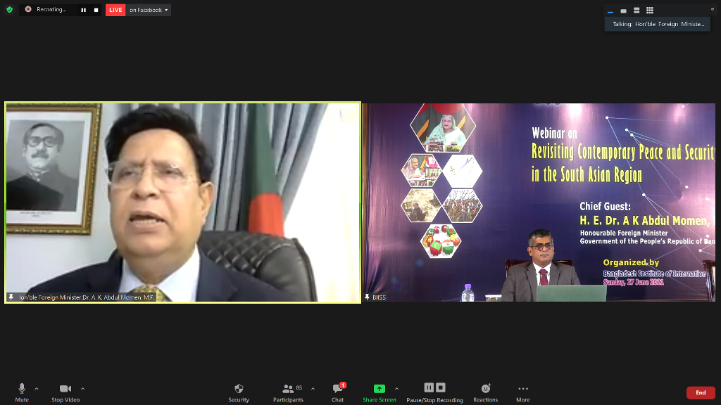 Bangladesh Institute of International and Strategic Studies (BIISS) organized a webinar on “Revisiting Contemporary Peace and Security Challenges in the South Asian Region” on 27 June 2021. H. E. Dr A K Abdul Momen, MP, Honourable Foreign Minister, Government of the People’s Republic of Bangladesh graced the occasion as the Chief Guest. Ambassador M Fazlul Karim, Chairman, BIISS chaired the webinar while Major General Md Emdad Ul Bari, ndc, psc, te, Director General, BIISS delivered the welcome address. Five distinguished scholars made presentations on various crucial security challenges in the South Asian region.